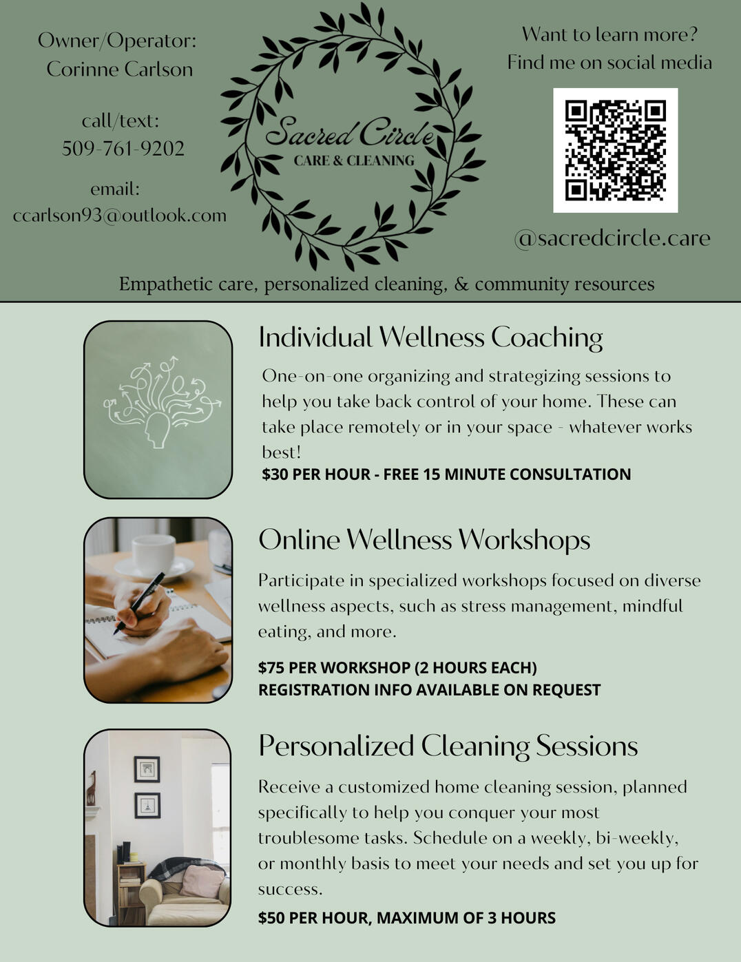 My name is Corinne Carlson, and I own Sacred Circle Care & Cleaning, based in Spokane, Washington. My business focuses on providing holistic home cleaning, non-medical caregiving, errand services, and companionship. I specialize in supporting seniors, postpartum parents, disabled individuals, and anyone who needs a little extra help. My goal is to create a calm, nurturing environment while reducing stress and enhancing well-being for my clients.
